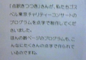 「ゴスペル東京チャリティーコンサート12th」の会場で点字を見つけました。実は私達が当日配布されるコンサートのプログラムを点訳したものです。 |