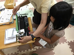 墨田区立隅田小学校4年生2クラスで点字体験授業を行いました。1日目は「読む」、2日目は「書く」を先生も一緒に体験しました。「間違った!」と言いながらも、最後までしっかり書きました。音楽会の招待状を点字で出せるかな? |
