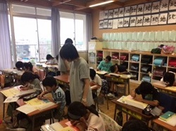墨田区立横川小学校4年生の点字体験学習がありました。教室が広くて聞こえづらかったかな?先生が「しまって下さい」と言っても一生懸命書いてくれました。 |