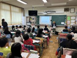 墨田区立横川小学校4年生の点字体験学習がありました。教室が広くて聞こえづらかったかな?先生が「しまって下さい」と言っても一生懸命書いてくれました。 |